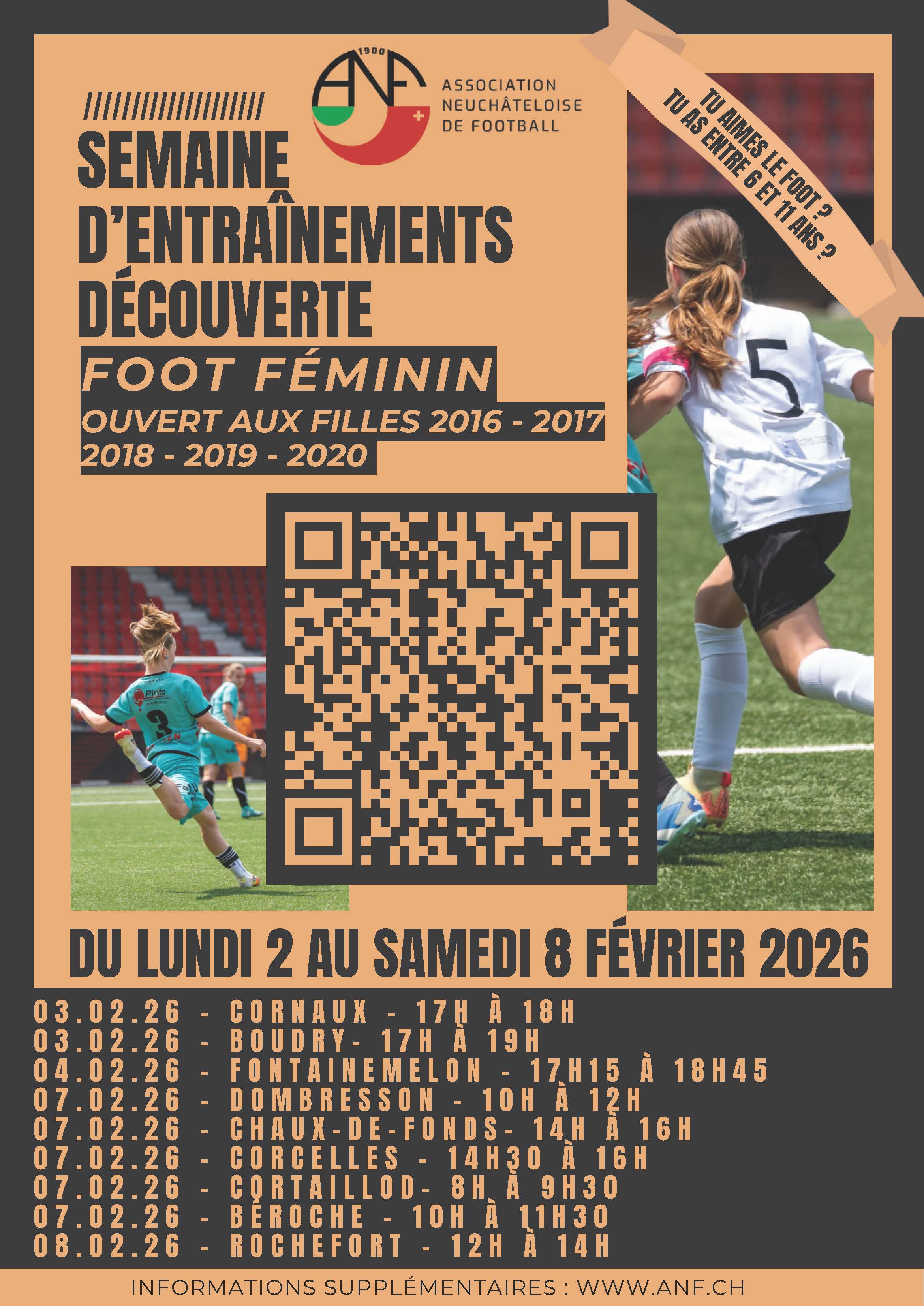 Dans le cadre du WEuro Legacy, l'ANF organise une semaine de découverte du football féminin qui se déroulera du lundi 2 au samedi 8 février 2026 ouverte aux filles de 6 à 11 ans (2016 et 2020), en proposant plusieurs entrainements découvertes dans différents lieux du canton !